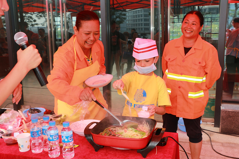 搶答活動(dòng)結(jié)束之后,進(jìn)入“小廚神”廚藝大比拼環(huán)節(jié)。由園林綠化工人、水電維修物業(yè)工人、保潔人員等進(jìn)城務(wù)工人員組成的5組家庭展開(kāi)了激烈的廚藝大比拼競(jìng)賽??矗N神們?cè)诟改傅闹笇?dǎo)下井井有條地備菜、炒菜、起鍋,忙得不亦樂(lè)乎。各色菜式色香味俱全,充分展現(xiàn)了孩子們“小當(dāng)家”的本領(lǐng)。半小時(shí)后,小廚神們?cè)诖蠹业臒崃艺坡曋型瓿闪吮荣惒似?,廚藝大師及現(xiàn)場(chǎng)觀眾根據(jù)完成的速度、菜品、味道等評(píng)出廚藝大賽一等獎(jiǎng)1名,二等獎(jiǎng)2名,三等獎(jiǎng)3名,優(yōu)秀獎(jiǎng)10名。
